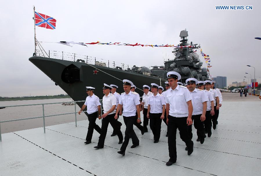Soldiers of Russian guided missile cruiser Varyag visit China's missile destroyer Zhengzhou in Shanghai, east China, May 19, 2014. Chinese and Russian naval forces held interchange activities on Monday to enhance mutual communication. (Xinhua/Zha Chunming)