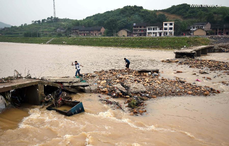 A bridge is damaged by flood water in Chenjiafang Town, Shaoyang County, central China's Hunan Province, May 26, 2014. Hunan issued the red alert of floods on May 25 as continuous downpours hit many parts of the province. A total of 400,000 people were affected and 16,776 displaced with the collapse of 520 houses. (Xinhua/Li Ga)