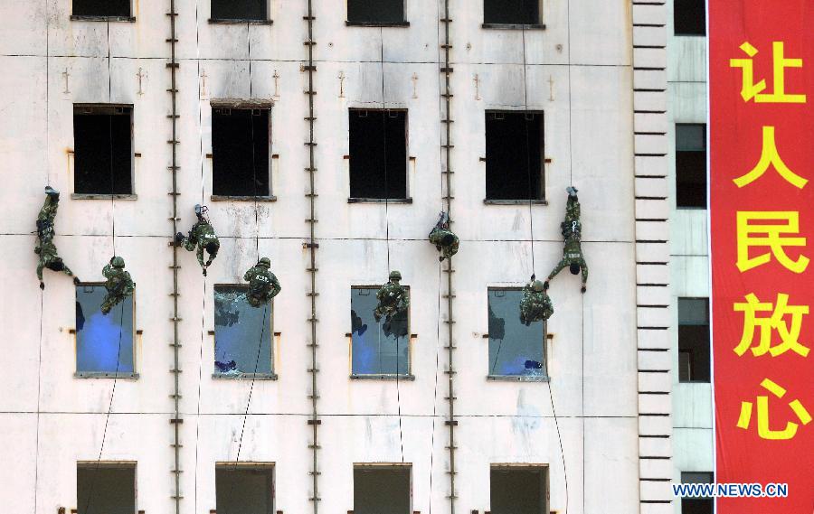 | Policemen show fighting skills during an anti-terrorism drill in Shaoxing, east China's Zhejiang Province, May 27, 2014. Police of Zhejiang Province held an anti-terror drill on Tuesday.(Xinhua/Wang Dingchang) |