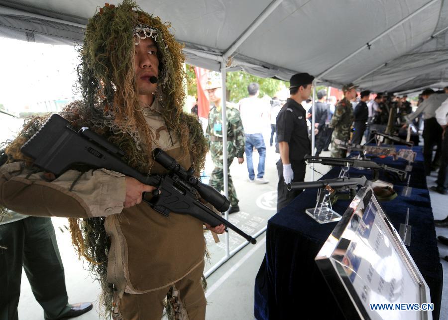 A sniper shows equipment at an anti-terrorism drill in Shaoxing, east China's Zhejiang Province, May 27, 2014. Police of Zhejiang Province held an anti-terror drill on Tuesday.(Xinhua/Wang Dingchang)