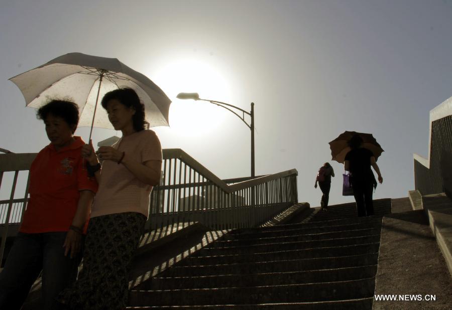 Pedestrians use their sunshades to block the sun when walking on a street in Beijing, capital of China, May 28, 2014. The city's meteorological department issued this year's first yellow alert for heat Tuesday. (Xinhua/Zhang Xu)
