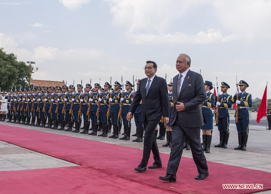 Chinese Premier Li Keqiang (L front) holds a welcoming ceremony for Malaysian Prime Minister Najib Razak (R front) before their talks in Beijing, capital of China, May 29, 2014. (Xinhua/Wang Ye)