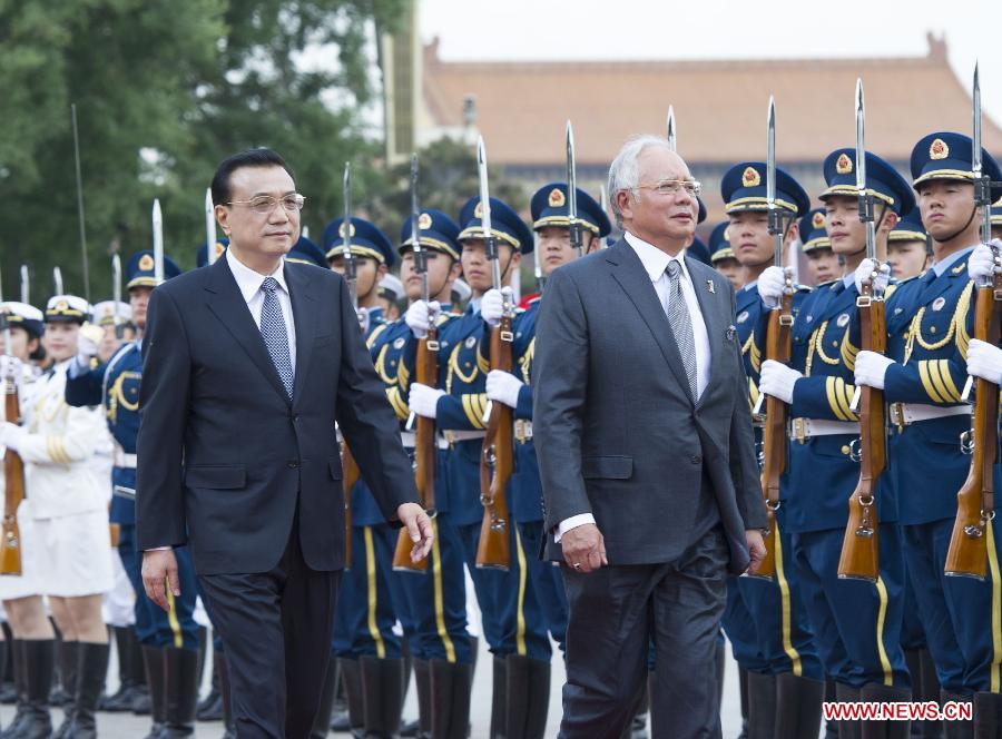 Chinese Premier Li Keqiang (L front) and Malaysian Prime Minister Najib Razak (R front) review the guard of honor at the welcoming ceremony before their talks in Beijing, capital of China, May 29, 2014. (Xinhua/Wang Ye)