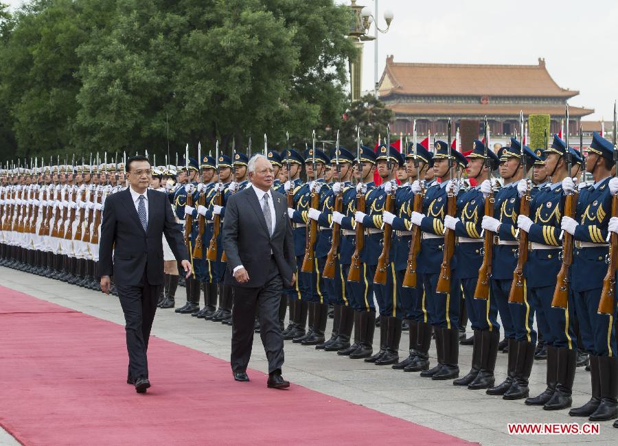 Chinese Premier Li Keqiang (L front) and Malaysian Prime Minister Najib Razak (R front) review the guard of honor at the welcoming ceremony before their talks in Beijing, capital of China, May 29, 2014. (Xinhua/Rao Aimin)