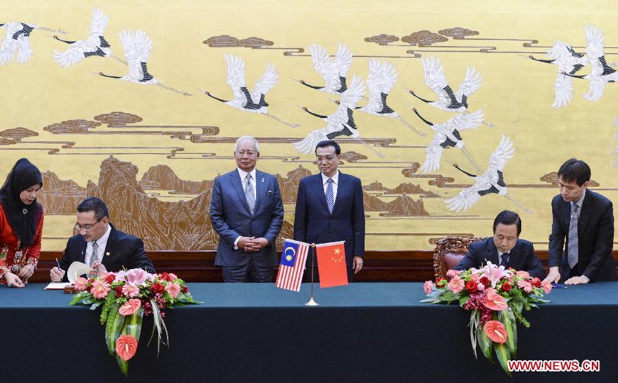 Chinese Premier Li Keqiang (R rear) and Malaysian Prime Minister Najib Razak (L rear) attend a signing ceremony of a number of bilateral cooperation documents after their talks in Beijing, capital of China, May 29, 2014. (Xinhua/Wang Ye)