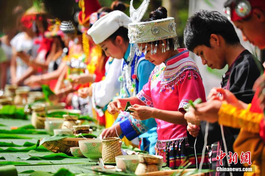 People of 26 ethnic groups in festival dresses make rice dumplings together to greet the Dragon Boat Festival at the Taiyanghe National Forest Park in Pu’er, south China’s Yunnan province. (China News Service/Liu Ranyang)
