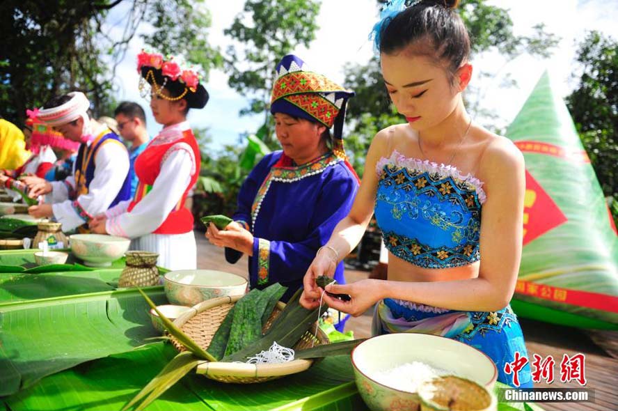 People of 26 ethnic groups in festival dresses make rice dumplings together to greet the Dragon Boat Festival at the Taiyanghe National Forest Park in Pu’er, south China’s Yunnan province. (China News Service/Liu Ranyang)
