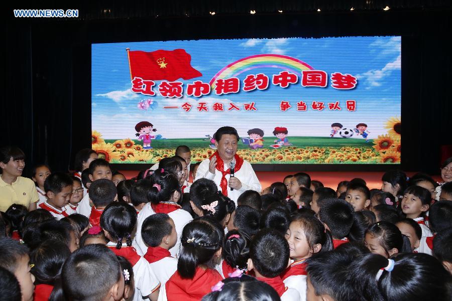 Chinese President Xi Jinping attends an initiation ceremony of Young Pioneers during his visit at Beijing Haidian National Primary School in Beijing, capital of China, May 30, 2014. Xi attended an activity to celebrate the upcoming International Children's Day at the primary school. (Xinhua/Ju Peng)