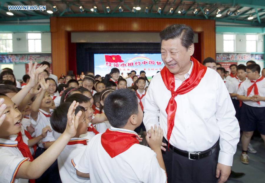 Chinese President Xi Jinping attends an initiation ceremony of Young Pioneers during his visit at Beijing Haidian National Primary School in Beijing, capital of China, May 30, 2014. Xi attended an activity to celebrate the upcoming International Children's Day at the primary school. (Xinhua/Ju Peng)