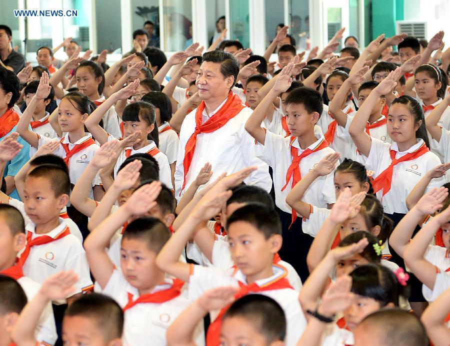 Chinese President Xi Jinping attends an initiation ceremony of Young Pioneers during his visit at Beijing Haidian National Primary School in Beijing, capital of China, May 30, 2014. Xi attended an activity to celebrate the upcoming International Children's Day at the primary school. (Xinhua/Li Tao)
