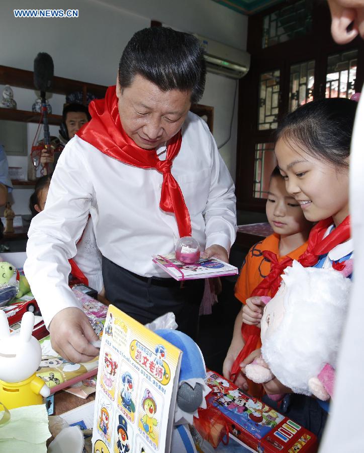 Chinese President Xi Jinping takes part in a charity sale activity with children during his visit at Beijing Haidian National Primary School in Beijing, capital of China, May 30, 2014. Xi attended an activity to celebrate the upcoming International Children's Day at the primary school. (Xinhua/Ju Peng)