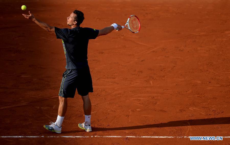 Germany's Philipp Kohlschreiber serves during the men's singles third round match against Andy Murray of Britain at the French Open in Paris, France, on May 31, 2014. The match was suspended in the fifth set for the onset of darkness. (Xinhua/Chen Xiaowei)