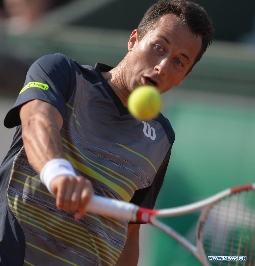 Germany's Philipp Kohlschreiber returns a shot during the men's singles third round match against Andy Murray of Britain at the French Open in Paris, France, on May 31, 2014. The match was suspended in the fifth set for the onset of darkness. (Xinhua/Chen Xiaowei)