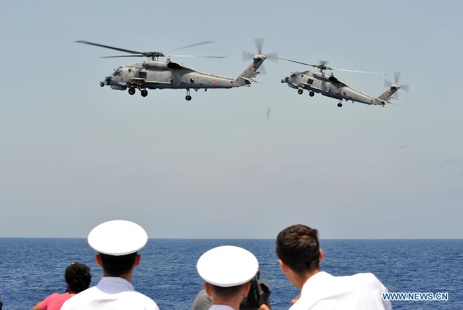 Two helicopters fly in a military drill in the Mediterranean Sea in Turkey, on May 31, 2014. Turkish Naval Forces launched a large-scale and wide-range military drill with the code name of White Storm-2014 in southwestern province of Antalya's Mediterranean Sea district. The training process will continue until June 1. (Xinhua/Cihan)