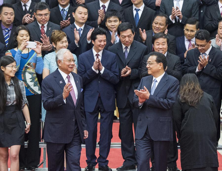 Chinese Premier Li Keqiang (2nd R front) and Malaysian Prime Minister Najib Razak (2nd L front) meet with representatives of youth from both China and Malaysia before the celebration of the 40th anniversary of the establishment of diplomatic relations between China and Malaysia in Beijing, capital of China, May 31, 2014. (Xinhua/Wang Ye)