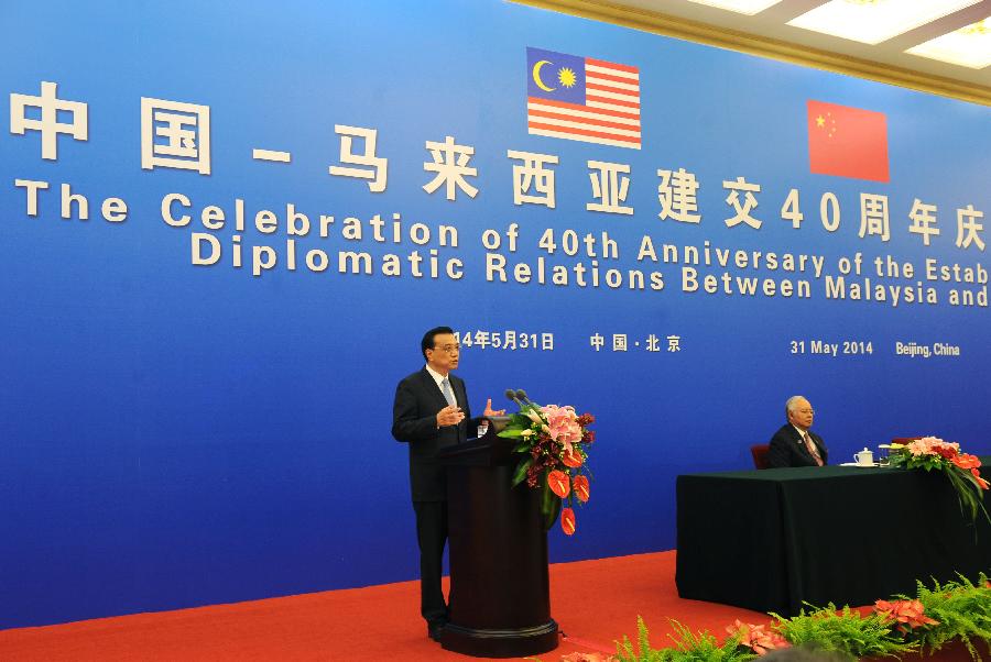 Chinese Premier Li Keqiang (L) speaks at the celebration of the 40th anniversary of the establishment of diplomatic relations between China and Malaysia in Beijing, capital of China, May 31, 2014. Malaysian Prime Minister Najib Razak also attended the celebration on Saturday. (Xinhua/Rao Aimin)