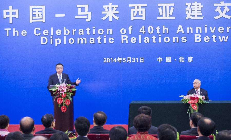 Chinese Premier Li Keqiang (L) speaks at the celebration of the 40th anniversary of the establishment of diplomatic relations between China and Malaysia in Beijing, capital of China, May 31, 2014. Malaysian Prime Minister Najib Razak also attended the celebration on Saturday. (Xinhua/Wang Ye)