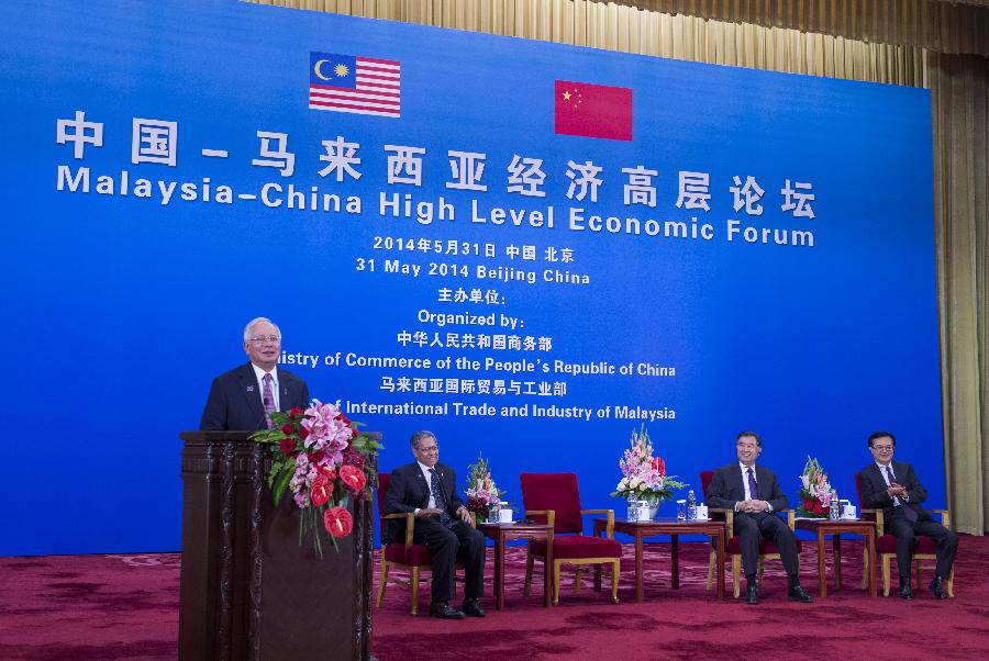 Malaysian Prime Minister Najib Razak (1st L) speaks at the Malaysia-China High Level Economic Forum in Beijing, capital of China, May 31, 2014. Chinese Vice Premier Wang Yang also attended the forum on Saturday. (Xinhua/Wang Ye)