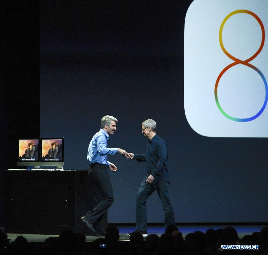 Apple's Chief Executive Tim Cook (R) and senior vice president of software engineering Craig Federighi are seen on the company's World Wide Developers Conference (WWDC2014) in San Francisco, the United States, June 2, 2014. Apple kicked off its developers conference on Monday. (Xinhua)