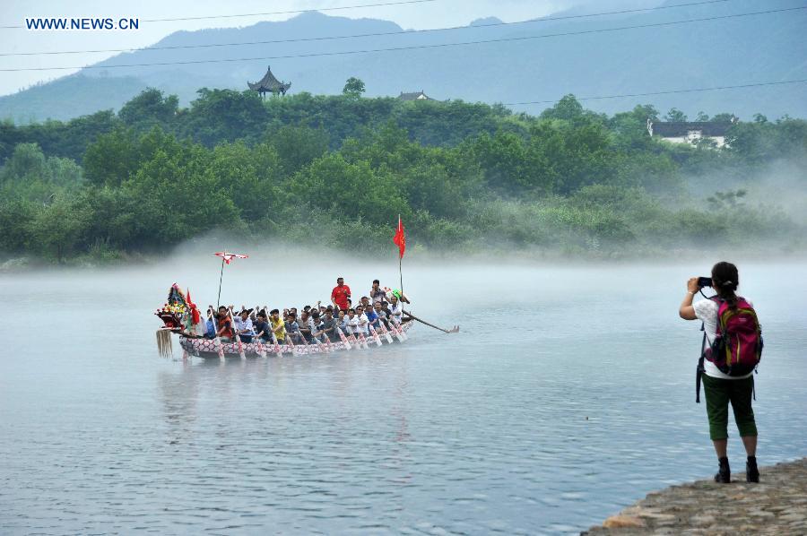 A tourist takes photos of competitors rowing on a dragon boat during a race held in the Taohuatan Scenic Area to celebrate the Dragon Boat Festival in Jingxian County, east China's Anhui Province, June 1, 2014. The Dragon Boat Festival, also known as Duanwu, is celebrated annually on the fifth day of the fifth month of the Chinese lunar calendar, which falls on June 2 this year. (Xinhua/Li Yuanbo)