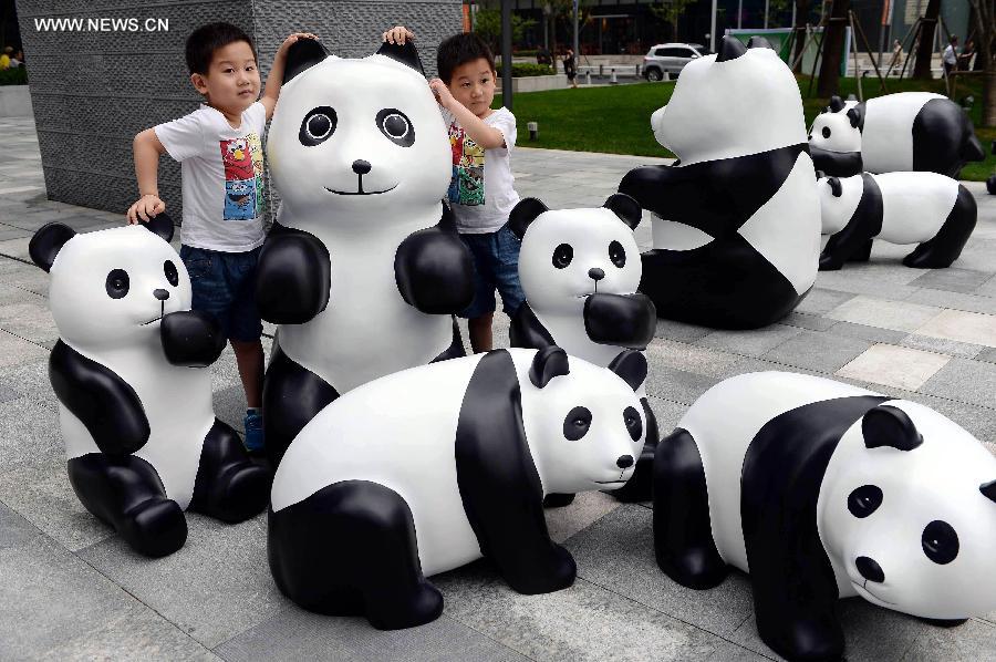 Children pose for photos with lovely "pandas" during the "1St panda" exhibition at Kerry Center Square in Shanghai, east China, June 2, 2014. A total of 100 pandas made of leftover moso bamboos were displayed during the exhibition. (Xinhua/Lai Xinlin)