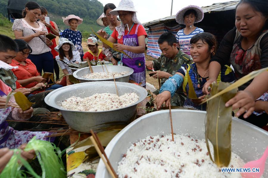 Armed police officers make Zongzi, a glutinous rice dumpling, along with earthquake-afflicted residents to celebrate the Dragon Boat Festival at a makeshift settlement in Hanxinlang Village under Kachang Town of Yingjiang County, Dehong Dai and Jingpo Autonomous Prefecture, southwest China's Yunnan Province, June 2, 2014. Yingjiang County was hit by a 6.1-magnitude earthquake on May 30 and a 5.6-magnitude one on May 24. The Dragon Boat Festival, also known as Duanwu, is celebrated annually on the fifth day of the fifth month of the Chinese lunar calendar, which falls on June 2 this year. (Xinhua/Hu Chao)