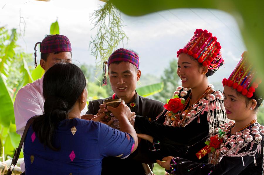 Yong and Bao celebrate with a family member on their wedding day, June 1, 2014. (Photo/Xinhua)