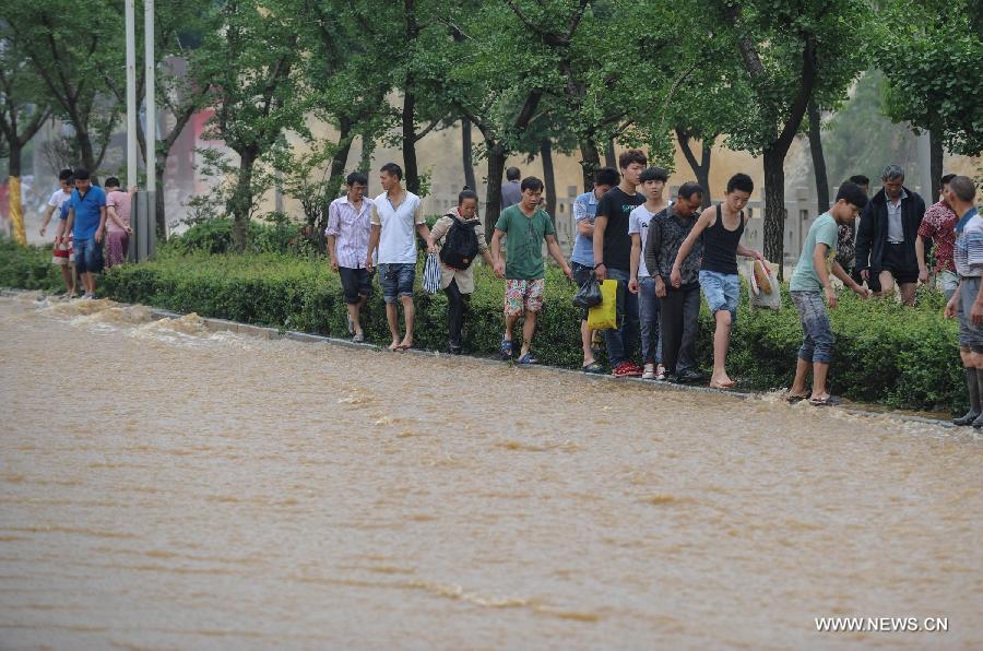 | People wade through a waterlogged road in Pingba County of Anshun city, southwest China's Guizhou province, June 3, 2014. Heavy rain has battered most areas of Guizhou since Monday. (Xinhua/Ou Dongqu) |