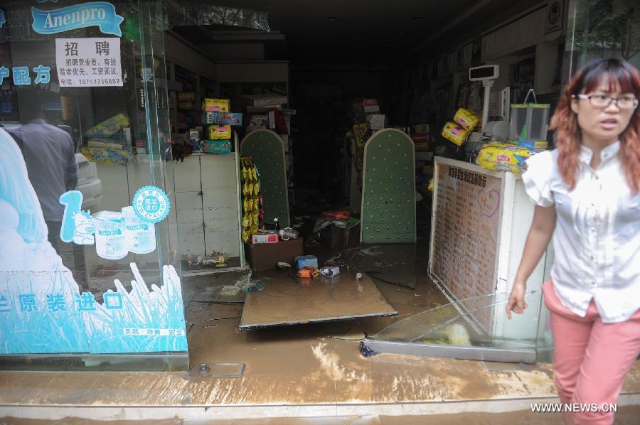 Photo taken on June 3, 2014 shows a store destroyed by rainstorm in Pingba County of Anshun city, southwest China's Guizhou province. Heavy rain has battered most areas of Guizhou since Monday. (Xinhua/Ou Dongqu)