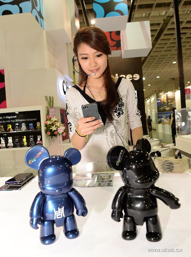 An exhibitor promotes a stereo set at the 2014 COMPUTEX Taipei, an international information and communications technology (ICT) show, in Taipei, southeast China's Taiwan, June 3, 2014. COMPUTEX Taipei is the largest ICT show in Asia. This year's COMPUTEX Taipei, opening on Tuesday, attracted more than 1,700 exhibitors, with the estimated visitor number exceeding 130,000. Deal oppotunities of billions of U.S. dollars will also be expected during the five-day event. (Xinhua/He Junchang)