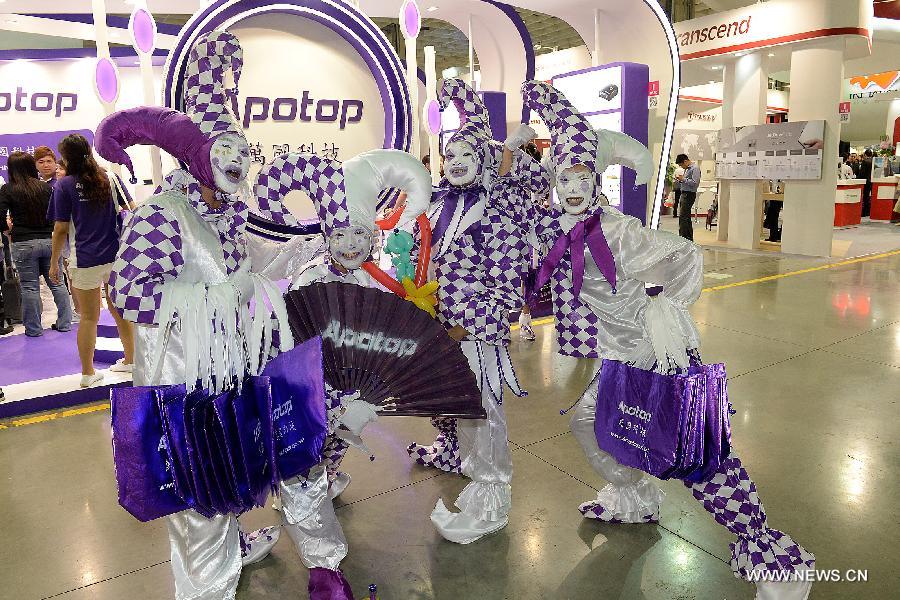 Clowns stage a promotive performance at the 2014 COMPUTEX Taipei, an international information and communications technology (ICT) show, in Taipei, southeast China's Taiwan, June 3, 2014. COMPUTEX Taipei is the largest ICT show in Asia. This year's COMPUTEX Taipei, opening on Tuesday, attracted more than 1,700 exhibitors, with the estimated visitor number exceeding 130,000. Deal oppotunities of billions of U.S. dollars will also be expected during the five-day event. (Xinhua/He Junchang)
