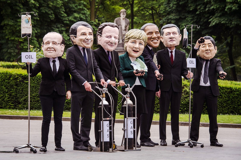 Oxfam demonstrators wearing masks of the G7 leaders demonstrate for an energy secure world near the EU Council in Brussels, Tuesday June 3, 2014. (Source: huanqiu.com)