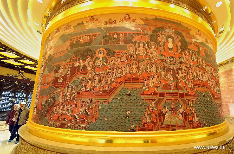 Tourists visit a lobby for respecting Buddhas at the Sui and Tang Dynasties Relic Garden in Luoyang, central China's Henan Province, April 7, 2013. Luoyang, one of the cradles of Chinese civilization and one of the "Four Great Ancient Capitals of China", tries to integrate its tourism spots, an effort to build a "Chinese Culture City."(Xinhua/Wang Song)