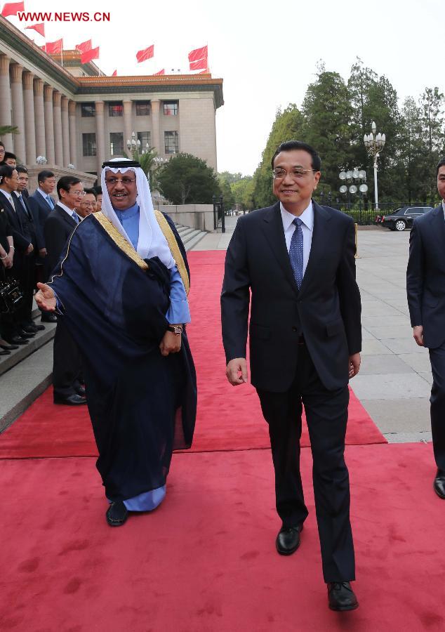 | Chinese Premier Li Keqiang (R, front) holds a welcoming ceremony for Kuwaiti Prime Minister Sheikh Jaber Al-Mubarak Al-Hamad Al-Sabah (L, front) before their talks in Beijing, capital of China, June 3, 2014. (Xinhua/Liu Weibing) |