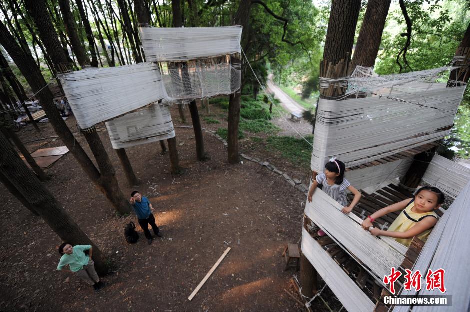 A unique tree house was unveiled in the grove besides the Architecture and Urban Planning School of Huazhong University of Science and Technology in Wuhan, capital of central China's Hubei province on June 3, 2014. The canopy of trees is the roof, and the wall is made of nylon rope. Between the gaps of the trunks, a dozen of wooden platform were set up, constituting several rooms. With the highest room 8 meters above the ground, the "built-up" area of the tree house is over 60 square meters. The design came from children's imagination. The construction took three months and over 40 kilometers of nylon rope and over 1,000 meters of steel wire were used. The tree house can bear the weight of 40 children. The trees are jacketed before the steel wires were bound. (Chinanews/Zhang Chang)