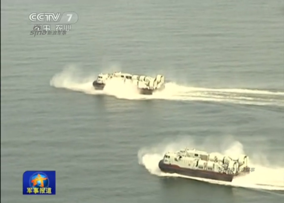 Two air cushion ships from the amphibian landing craft Changbaishan participate in the actual-combat training.