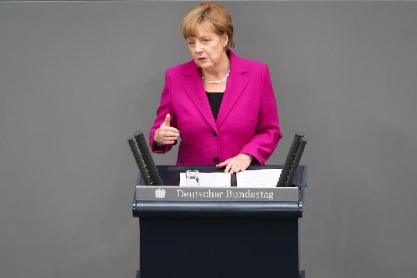 | German Chancellor Angela Merkel speaks on the upcoming G7 summit during a meeting session at the Bundestag, the lower house of parliament, in Berlin, Germany, on June 4, 2014. The G7 Summit set for Brussels on June 4-5 will focus on Ukraine situation, ties with Russia, global economy and energy security, according to preliminary agenda unveiled by the European Union (EU). (Xinhua/Zhang Fan) |