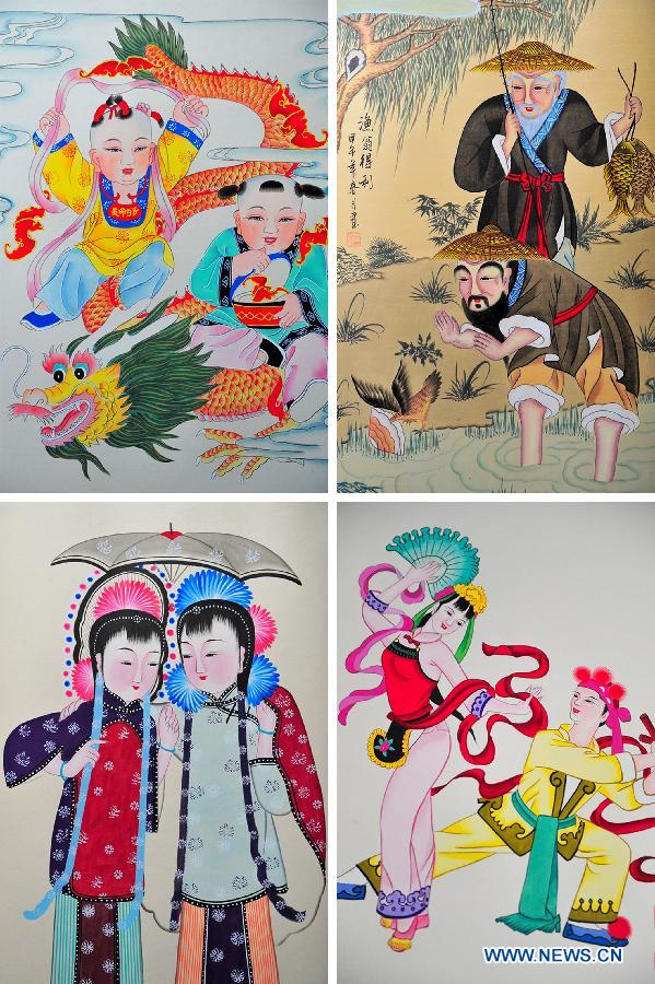 | Combined photo taken on June 1, 2014 shows Gaomi ash-patting new year paintings, in Gaomi, east China's Shandong Province. Gaomi ash-patting new year painting is a traditional art craft which has enjoyed a history of over 500 years and only existed in Gaomi. It has been included in the list of national intangible cultural heritages. (Xinhua/Guo Xulei) |