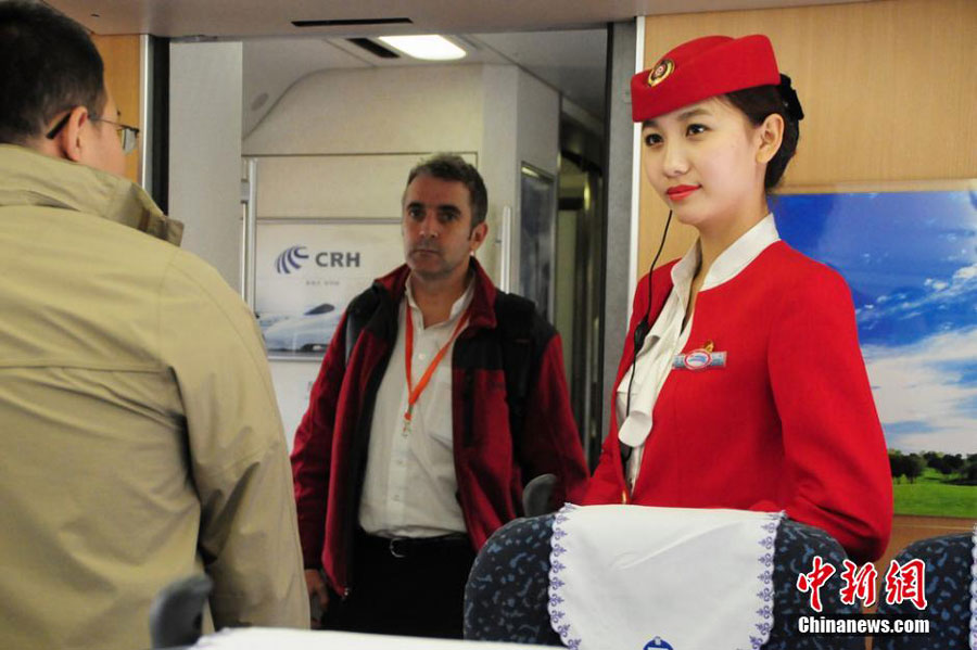 A train conductor of Uyghur ethnicity stand in a carriage during a trial run of a high-speed train linking the northwest Chinese provincial capital cities of Lanzhou, in Gansu province, and Urumqi, in the Xinjiang Uyghur Autonomous Region, on Jun 3, 2014. The 1,776km-long railway is expected to begin operations at the end of the year. This will also be the first high-speed railway in Xinjiang. [Photo: Chinanews.com]
