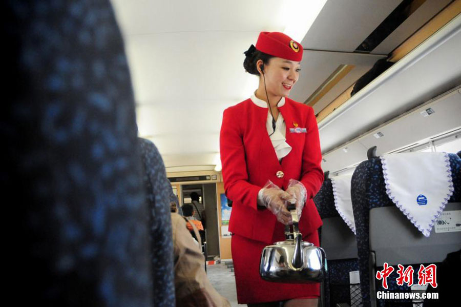 A train conductor of Uyghur descent gives water during a trial run of a high-speed train linking the northwest Chinese provincial capital cities of Lanzhou, in Gansu province, and Urumqi, in the Xinjiang Uyghur Autonomous Region, on Jun 3, 2014. The 1,776km-long railway is expected to begin operations at the end of the year. This will also be the first high-speed railway in Xinjiang. [Photo: Chinanews.com]