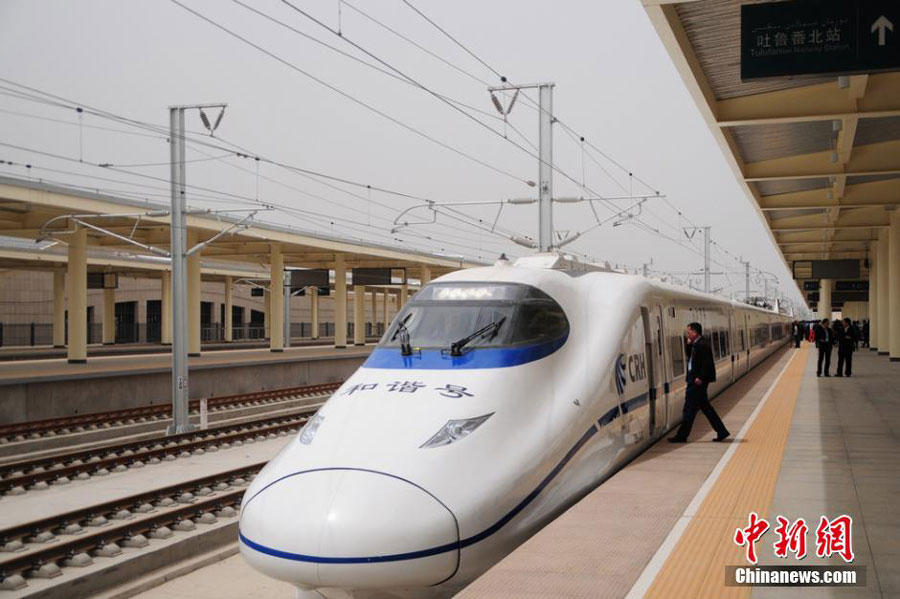A high-speed train gets ready for its trial run on rails linking the northwest Chinese provincial capital cities of Lanzhou, in Gansu province, and Urumqi, in the Xinjiang Uyghur Autonomous Region, on Jun 3, 2014. The 1,776km-long railway is expected to begin operations at the end of the year. This will also be the first high-speed railway in Xinjiang. [Photo: Chinanews.com]
