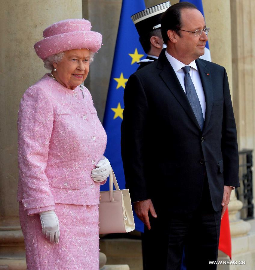 British Queen Elizabeth II (L) and French President Francois Hollande pose for a photo at the Elysee Palace in Paris, June 5, 2014. British Queen Elizabeth II on Thursday embarked on a three-day state visit to France to mark the 70th Anniversary of the Normandy landings during WWII, Buckingham Palace has announced. (Xinhua/Chen Xiaowei)