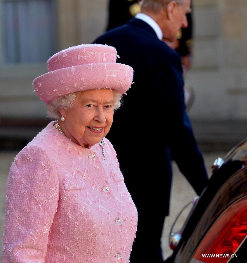 British Queen Elizabeth II smiles before getting into a car after visiting the Elysee Palace in Paris, June 5, 2014. British Queen Elizabeth II on Thursday embarked on a three-day state visit to France to mark the 70th Anniversary of the Normandy landings during WWII, Buckingham Palace has announced. (Xinhua/Chen Xiaowei)