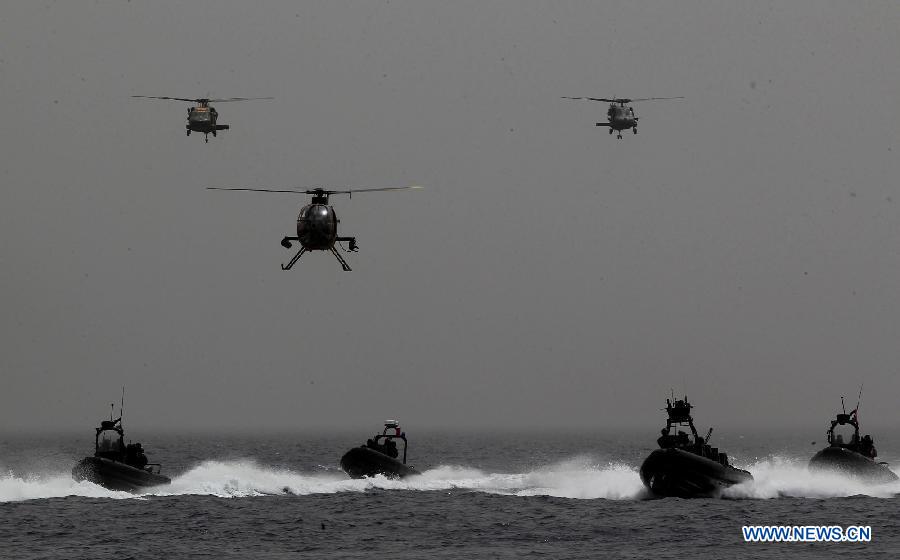 Special operations forces participate in the "Eager Lion" military drill at the Gulf of Aqaba, some 330 kilometers south of Amman, Jordan, June 5, 2014. The Jordan-hosted "Eager Lion" international military drill with the participation of 22 countries seeks to strengthen the skills of the Jordanian army and enhance cooperation, the army said.(Xinhua/Mohammad Abu Ghosh)