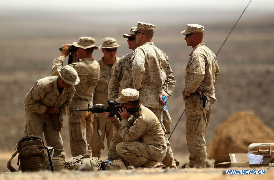 US soldiers watch tanks during the "Eager Lion" military drill at the Gulf of Aqaba, some 330 kilometers south of Amman, Jordan, June 5, 2014. The Jordan-hosted "Eager Lion" international military drill with the participation of 22 countries seeks to strengthen the skills of the Jordanian army and enhance cooperation, the army said.(Xinhua/Mohammad Abu Ghosh)