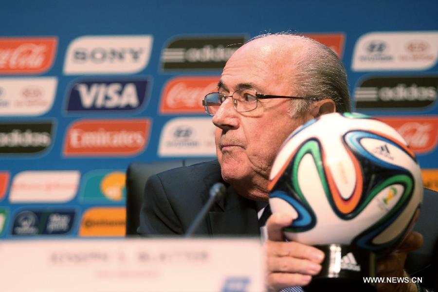 FIFA's president Joseph Blatter holds the FIFA World Cup official soccer ball during a press conference following a meeting of the FIFA Organising Committee for the World Cup 2014 in Sao Paulo, Brazil, on June 5, 2014. Sao Paulo will host the opening match of the World Cup on June 12. (Xinhua/Rahel Patrasso)