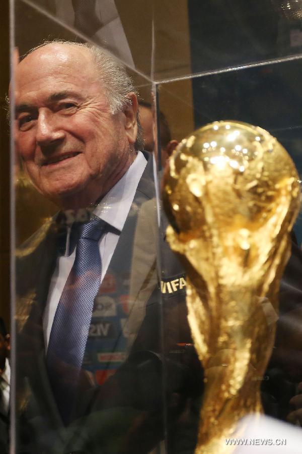 | FIFA's president, Joseph Blatter poses next to the World Cup trophy after a press conference following a meeting of the FIFA Organising Committee for the World Cup 2014 in Sao Paulo, Brazil, on June 5, 2014. Sao Paulo will host the opening match of the World Cup on June 12. (Xinhua/Rahel Patrasso) |