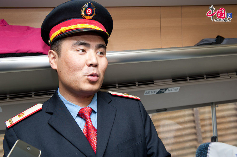 Adi Turdi is excited to be qualified as a CRH driver. Adi is one of the only two train drivers of the Uygur ethnic group in Xinjiang, the other being his supervisor. He used to operate freight trains, local trains and express trains. [Photo by Chen Boyuan / China.org.cn]