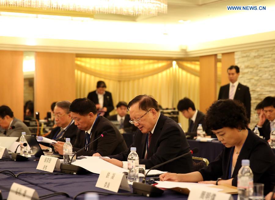 Former Chinese State Councilor Tang Jiaxuan (2nd R, front) attends a meeting of the 21st Century Committee for China-Japan Friendship Committee, in Nagasaki, Japan, on June 5, 2014. (Xinhua/Liu Tian)