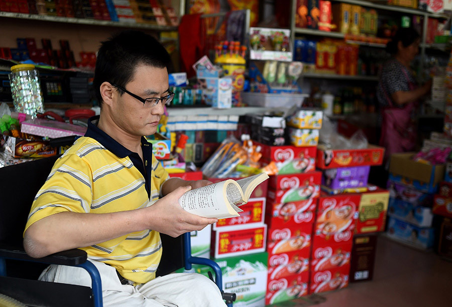 Jia Hongwei reads in the grocery store run by his family. (Xinhua/Jin Liangkuai)